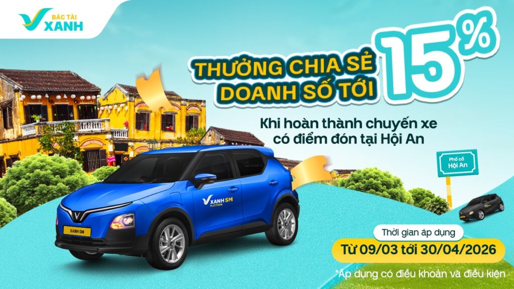 [Bác Tài Xanh Car Platform] Thưởng chia sẻ doanh số tới 15% khi hoàn thành chuyến xe có điểm đón tại Phố cổ Hội An
