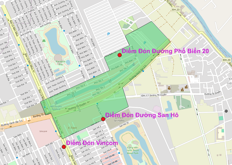 Đi theo lối ra cổng chính, rẽ phải 100m đi, đi dọc theo đường Phố Biển 20 để ra điểm đón.