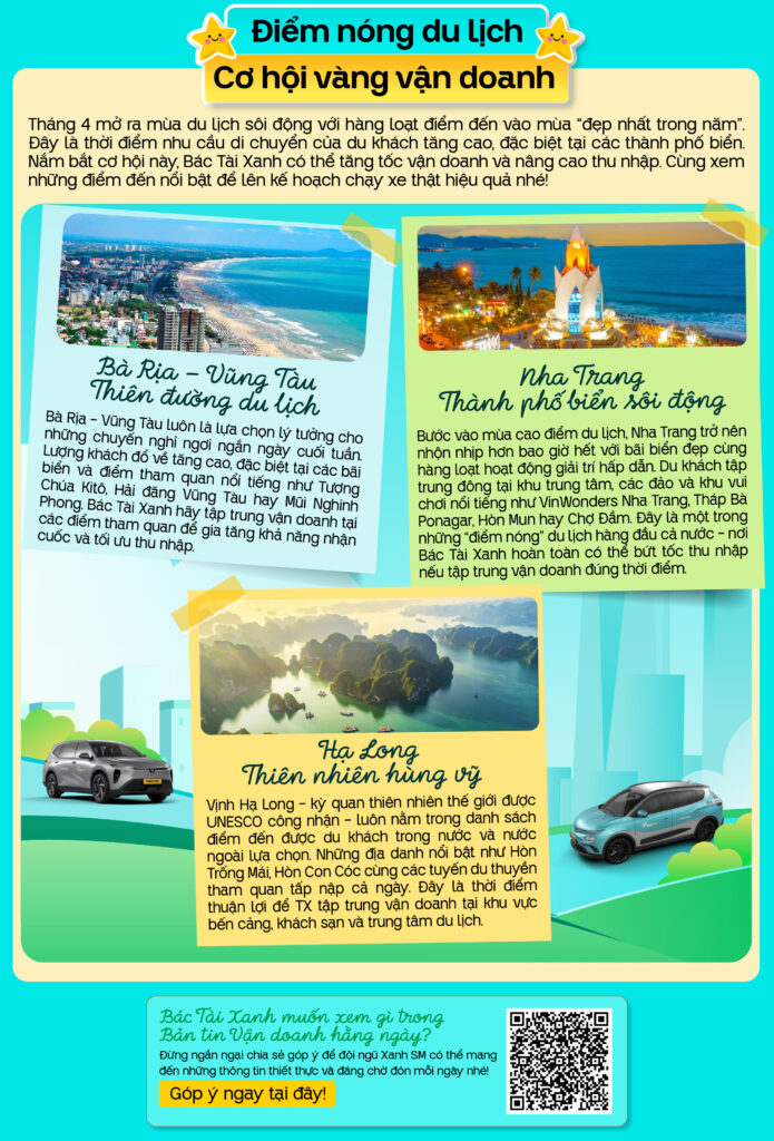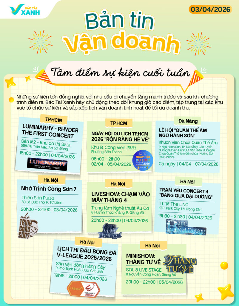 Cuối tuần đang đến gần với nhiều sự kiện và điểm nóng du lịch trên toàn quốc. Đây là thời điểm nhu cầu di chuyển tăng cao, mở ra cơ hội để Bác Tài Xanh gia tăng cuốc và bứt tốc thu nhập. Cùng Bản tin vận doanh ngày 03/04 khám phá để lên kế hoạch vận doanh hiệu quả nhé!