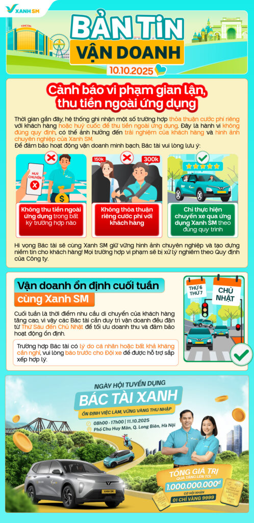 Thời gian gần đây, hệ thống ghi nhận một số trường hợp thỏa thuận cước phí riêng với khách hàng hoặc huỷ cuốc để thu tiền ngoài ứng dụng. Đây là hành vi không đúng quy định, có thể ảnh hưởng đến trải nghiệm của khách hàng và hình ảnh chuyên nghiệp của Xanh SM.