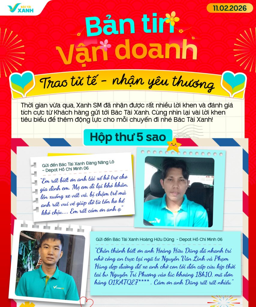 “Hộp thư 5 sao” trong Bản tin vận doanh ngày 11/02 sẽ mang tới những câu chuyện “trao tử tế – nhận yêu thương” đầy ý nghĩa của các Bác Tài Xanh trên toàn quốc. Hy vọng đây sẽ là động lực để Bác Tài Xanh luôn duy trì và lan tỏa những hành động đẹp tới Khách hàng trên từng chuyến xe Xanh mỗi ngày!