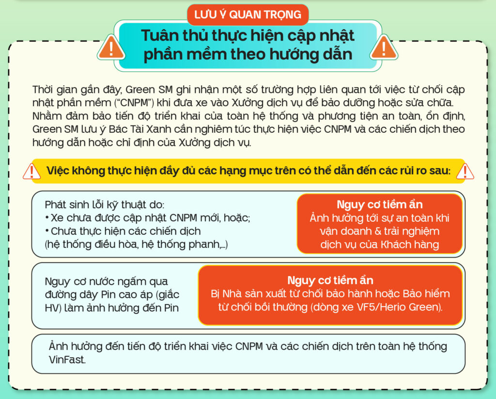 Mở đầu là các tiêu chuẩn quan trọng về diện mạo, yếu tố góp phần tạo nên hình ảnh chuyên nghiệp trong từng hành trình. Đồng thời, Bác Tài Xanh cần đặc biệt lưu ý tuân thủ việc cập nhật phần mềm theo hướng dẫn để đảm bảo phương tiện luôn ổn định, an toàn.