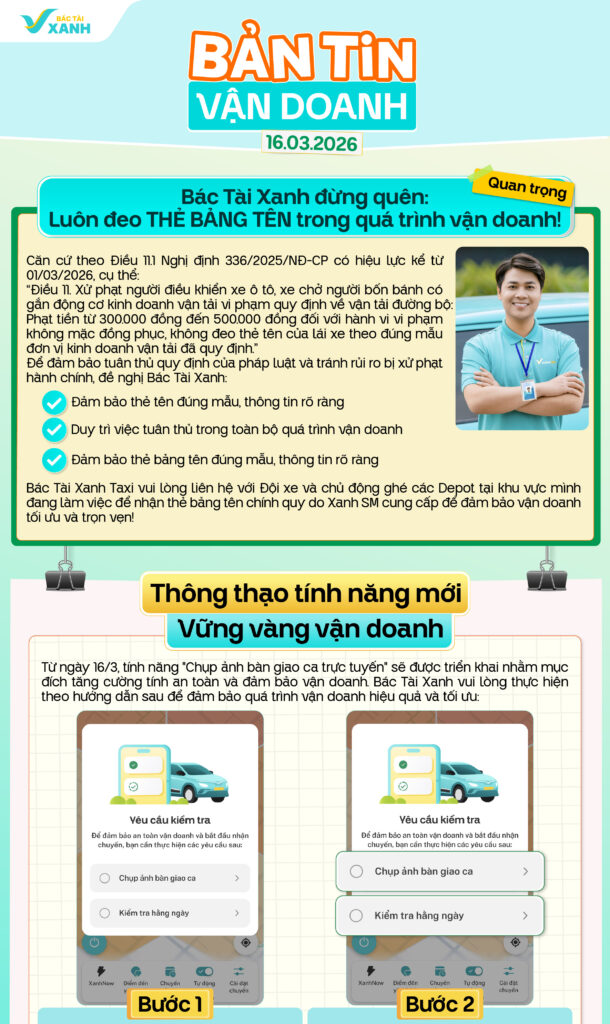 Việc đeo thẻ bảng tên xuyên suốt quá trình vận doanh là vô cùng quan trọng để đảm bảo tuân thủ quy định của của pháp luật và tránh rủi ro bị xử phạt hành chính. Hãy cùng Xanh SM tham khảo ngay Bản tin vận doanh hôm nay nhé!