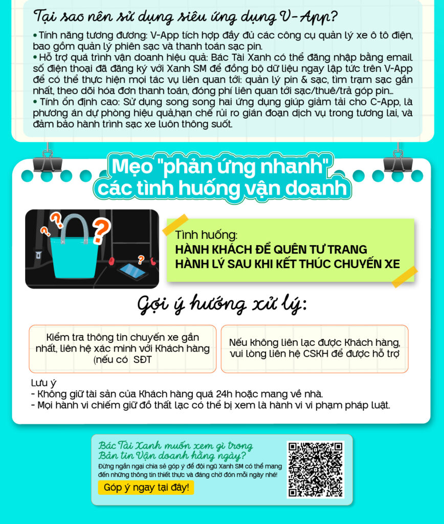 Và đừng quên, nếu Bác Tài Xanh có góp ý hay chia sẻ thêm mong muốn, hãy gửi lại cho đội ngũ Xanh SM để Bản tin mỗi ngày thêm thiết thực và đáng mong chờ hơn!