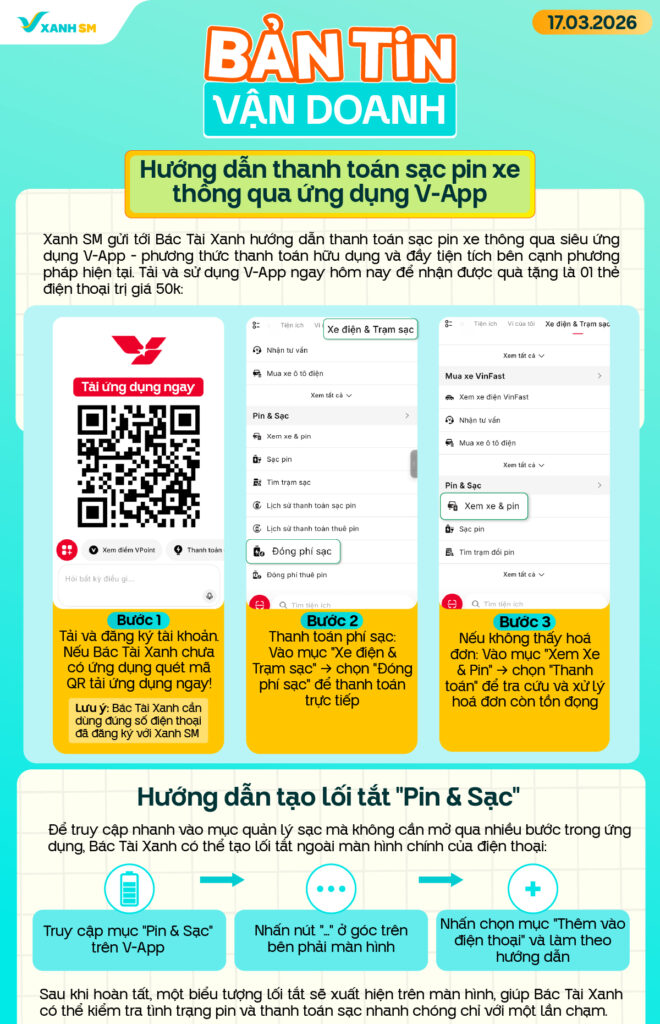 Bản tin vận doanh 17/03 gửi tới Bác Tài Xanh hướng dẫn thanh toán sạc pin xe thông qua ứng dụng V-App – một phương thức thanh toán hữu dụng bên cạnh phương thức hiện tại. Cùng tham khảo ngay nhé!
