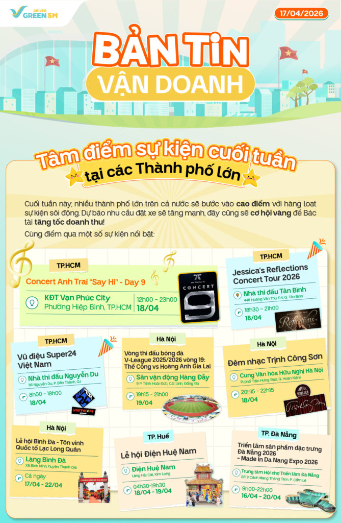 Cuối tuần đang đến gần với nhiều sự kiện, đây là thời điểm nhu cầu di chuyển tăng cao, mở ra cơ hội để Bác Tài Xanh gia tăng cuốc và bứt tốc thu nhập. Bên cạnh đó là những lưu ý về điểm đậu đỗ tại các tòa nhà, văn phòng, trung tâm thương mại sẽ giúp cho các Bác Tài Xanh vận doanh mượt mà trong dịp lễ lớn sắp tới. Cùng Bản tin vận doanh ngày 17/04 khám phá nhé!