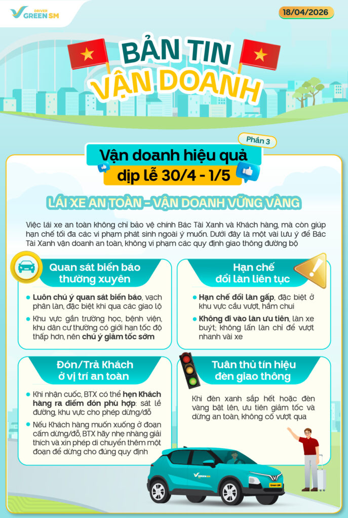 Bản tin vận doanh ngày 18/04 mang đến những lưu ý quan trọng giúp Bác Tài Xanh vận doanh an toàn và không vị phạm các quy định giao thông đường bộ. Bên cạnh đó là cập nhật mới nhất về chính sách vận doanh dành cho các Bác Tài Xanh Van. Cùng tìm hiểu ngay!