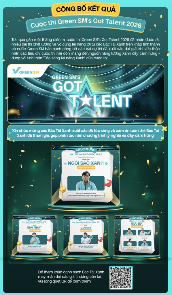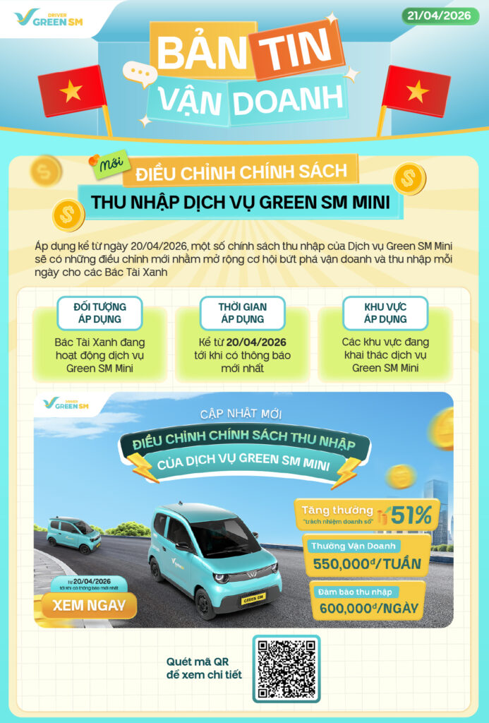 Nhằm mở rộng cơ hội bứt phá vận doanh và giúp Bác Tài Xanh gia tăng thu nhập mỗi ngày, chính sách thu nhập dịch vụ Green SM Mini sẽ có những điều chỉnh mới, áp dụng từ ngày 20/04/2026. Cùng Bản tin Vận doanh hôm nay khám phá chi tiết những điều chỉnh đáng chú ý trong chính sách, đồng thời gửi lời chúc mừng đến những Bác Tài Xanh xuất sắc đã tỏa sáng và chinh phục các giải thưởng tại cuộc thi Green SM’s Got Talent 2026.