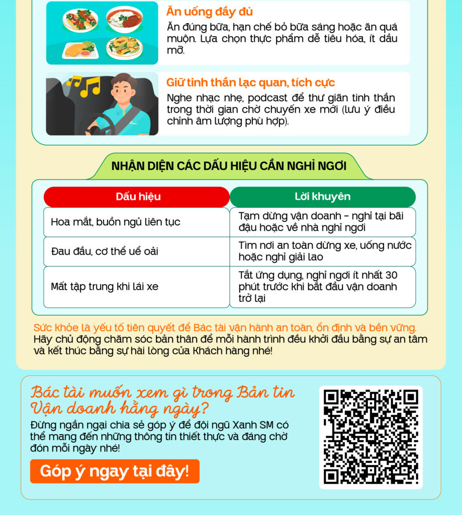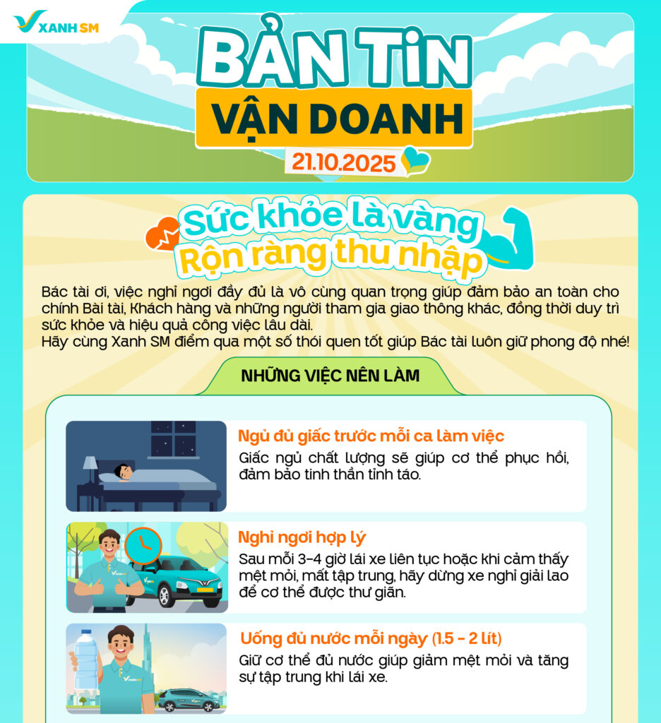 Và đừng quên, nếu Bác tài có góp ý hay chia sẻ thêm mong muốn, hãy gửi lại cho đội ngũ Xanh SM để Bản tin mỗi ngày thêm thiết thực và đáng mong chờ hơn!