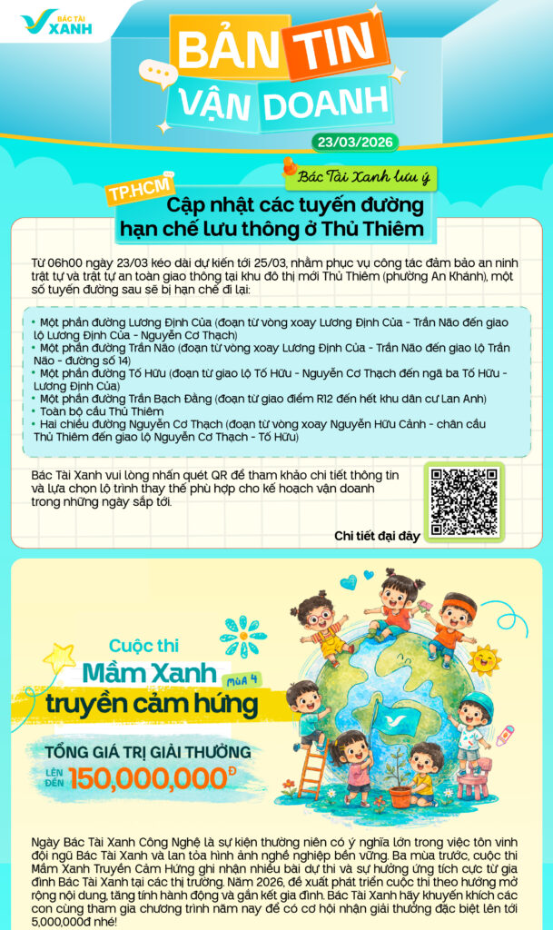 Cuộc thi “Mầm Xanh truyền cảm hứng” đã chính thức được triển khai sau sự thành công của 3 mùa trước đó. Bác Tài Xanh hãy cho con tham dự chương trình để có cơ hội rinh các giải thưởng có tổng giá trị lên tới 150 triệu đồng nhé! Ngoài ra, Bản tin vận doanh 23/3 còn cập nhật thông tin quan trọng giúp Bác Tài Xanh tại Tp. Hồ Chí Minh có thể vận doanh hiệu quả những ngày sắp tới. Cùng Xanh SM theo dõi ngay bây giờ nhé!