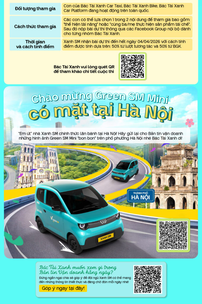 Và đừng quên, nếu Bác Tài Xanh có góp ý hay chia sẻ thêm mong muốn, hãy gửi lại cho đội ngũ Xanh SM để Bản tin mỗi ngày thêm thiết thực và đáng mong chờ hơn!