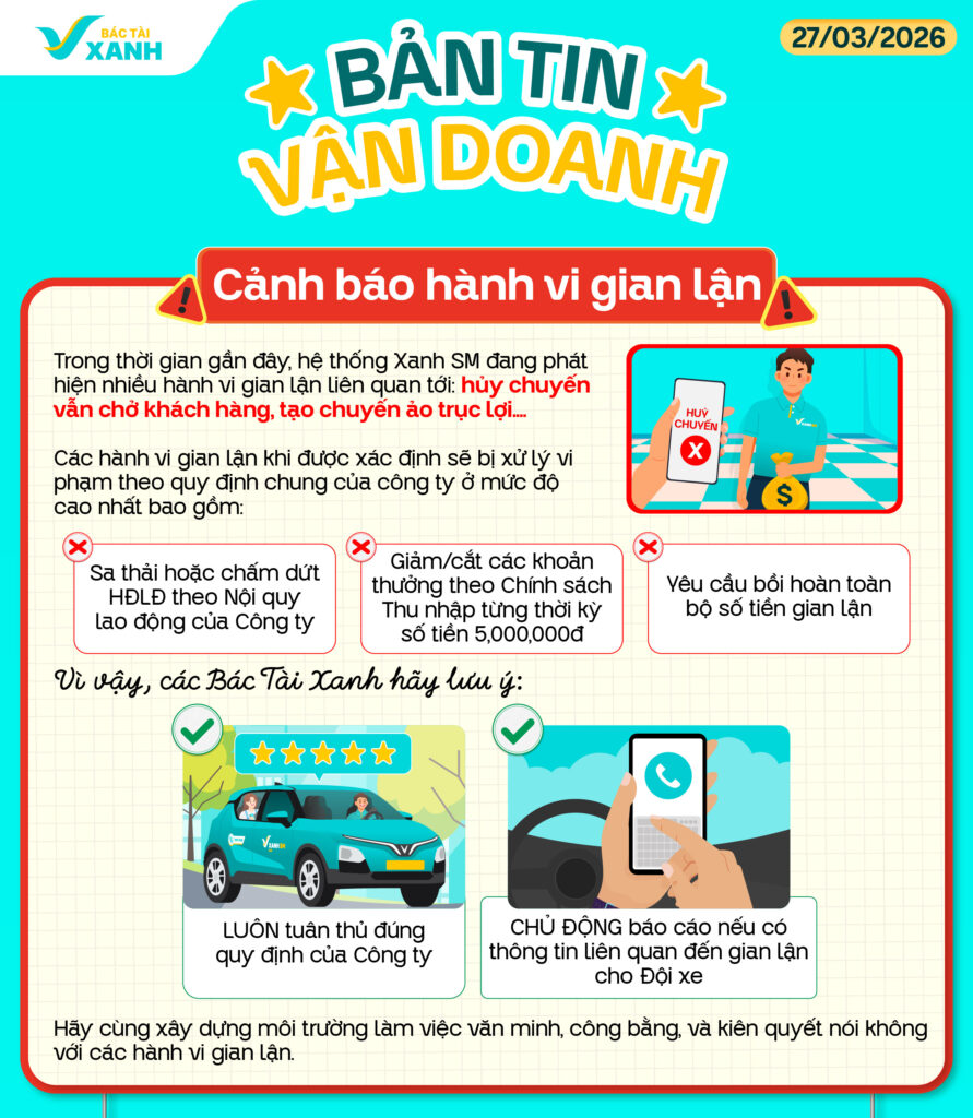 Tuân thủ quy định chung của công ty không chỉ giúp mang lại trải nghiệm xuất sắc cho Khách hàng mà còn giúp Bác Tài Xanh vận doanh an toàn, hiệu quả và gia tăng cơ hội thu nhập. Hãy cùng bản tin vận doanh 27/3 tham khảo những lưu ý quan trọng mà Bác Tài Xanh cần lưu tâm xuyên suốt quá trình hoạt động.