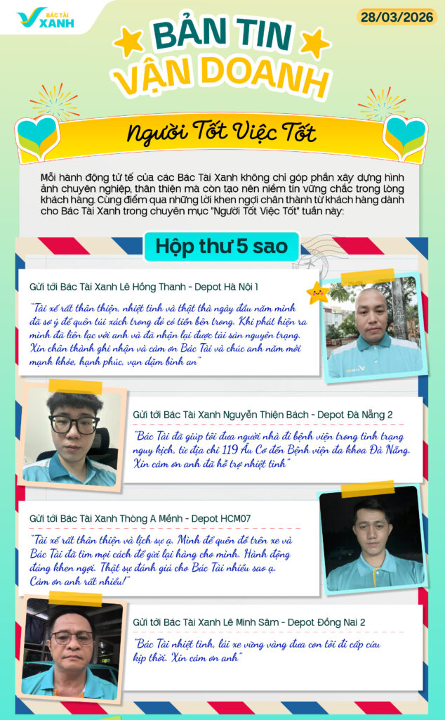 Bản tin vận doanh ngày 28/3 bên cạnh chuyên mục “Người tốt việc tốt” – tuyên dương những Bác Tài Xanh có hành động đẹp – sẽ còn mang tới cho Bác Tài Xanh thông tin hấp dẫn về các hoạt động đang diễn ra của sự kiện “Ngày hội Bác Tài Xanh Công Nghệ 2026” và chương trình thưởng giới thiệu cực hấp dẫn.
