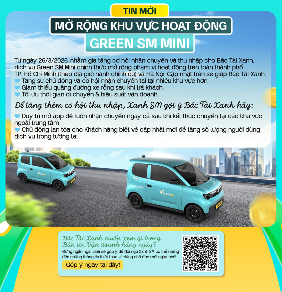 Và đừng quên, nếu Bác Tài Xanh có góp ý hay chia sẻ thêm mong muốn, hãy gửi lại cho đội ngũ Xanh SM để Bản tin mỗi ngày thêm thiết thực và đáng mong chờ hơn!