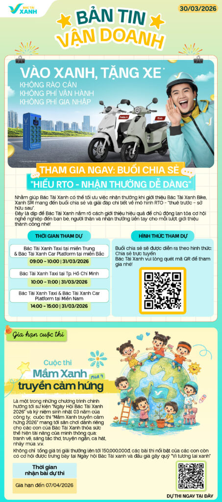 Bản tin vận doanh ngày 30/03 sẽ mang tới cho Bác Tài Xanh thông tin về buổi chia sẻ “Hiểu RTO – Nhận thưởng dễ dàng”, thời gian gia hạn nhận bài dự thi của cuộc thi “Mầm Xanh truyền cảm hứng” cũng như cập nhật mới nhất về dịch vụ Green SM Mini. Cùng tìm hiểu ngay!