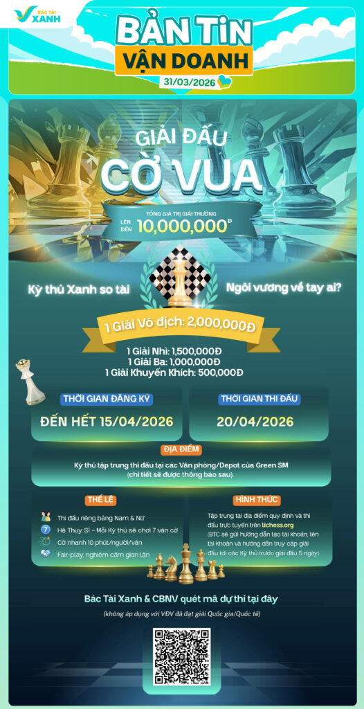 Trong bản tin vận doanh 31/03 các Bác Tài Xanh sẽ được hướng dẫn cách đăng ký tham gia “Giải đấu cờ vua” – cuộc thi thuộc sự kiện “Ngày Hội Bác Tài Xanh Công Nghệ 2026” và các hướng dẫn giúp quá trình vận doanh trơn tru từ đó tăng trải nghiệm Khách hàng. Theo dõi ngay bây giờ nhé!