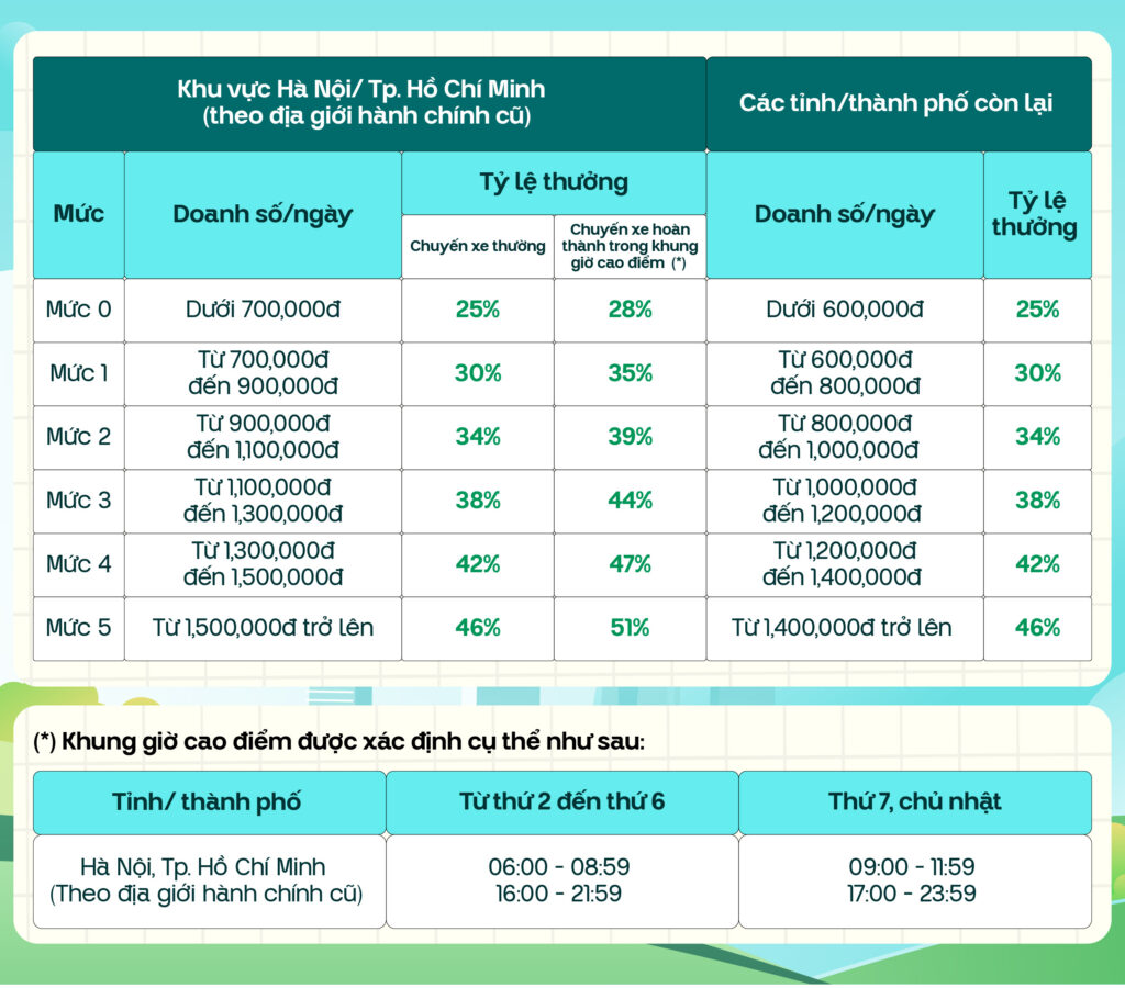 • Tăng cường vận doanh bằng cách: bắt đầu ca vận doanh từ sớm (đặc biệt trong các khung giờ cao điểm) tại các khu vực có nhu cầu cao (trung tâm thành phố, trung tâm thương mại, tòa nhà văn phòng…) để sớm đạt mốc chuyến xe yêu cầu, từ đó khai thác tối đa cơ hội từ chương trình thưởng.