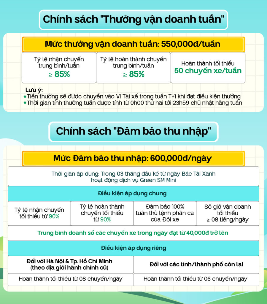 • Đối tượng áp dụng: Bác Tài Xanh đang hoạt động dịch vụ Green SM Mini