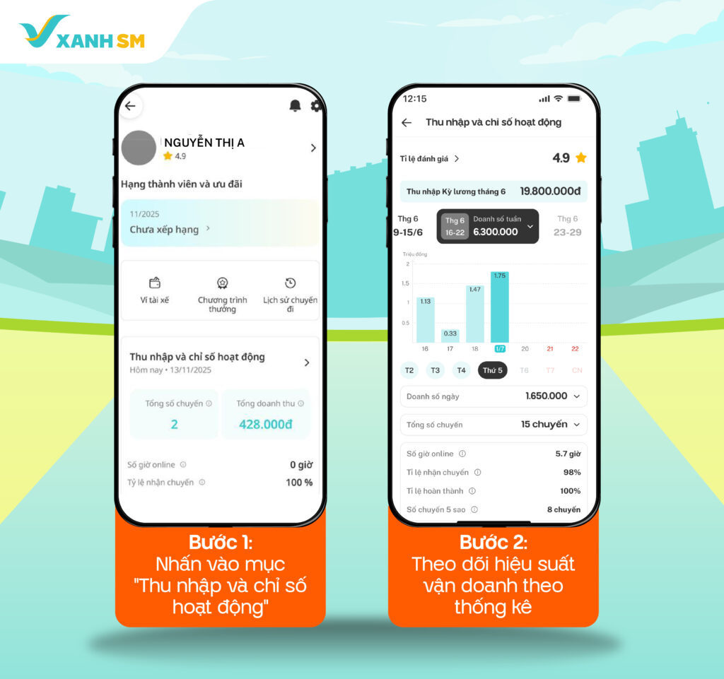 Các chỉ số được hiển thị trực quan, rõ ràng hơn, giúp Bác Tài dễ dàng theo dõi hiệu suất vận doanh. Chi tiết giao diện như sau: