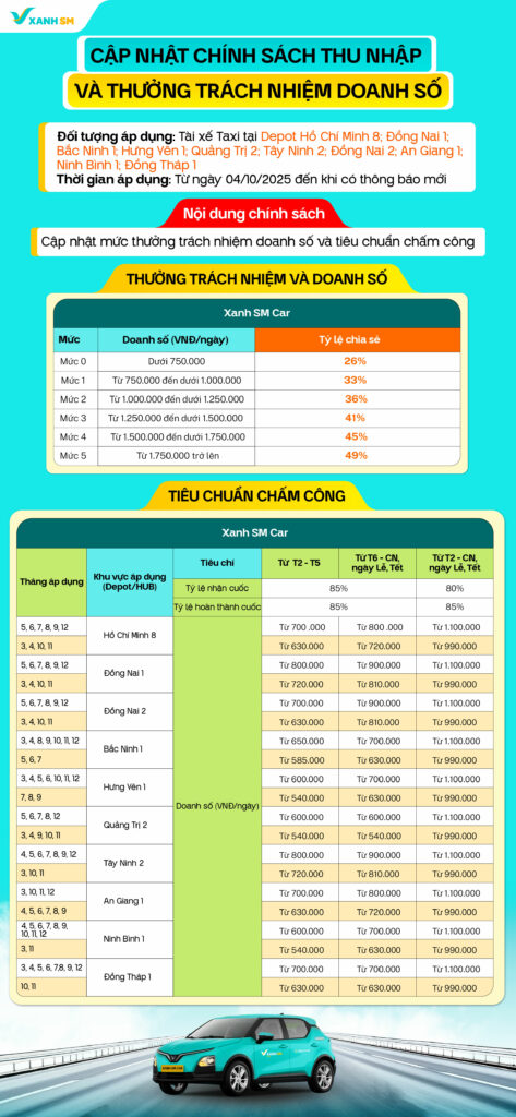 Với mục đích hỗ trợ Bác tài quản lý thu nhập một cách minh bạch và chủ động hơn, Xanh SM xin thông báo về việc cập nhật Chính sách thu nhập với tỷ lệ chia sẻ doanh số và tiêu chuẩn chấm công mới.