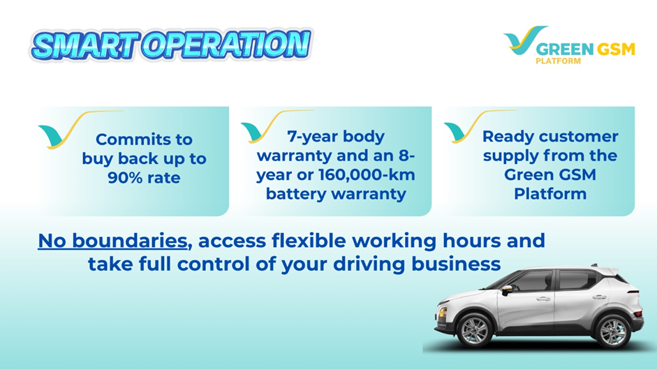 Sa pamamagitan ng “4 Smarts” ng Green GSM Platform, makukuha mo ang best of both worlds: isang professional na paraan para kumita at isang personal na sasakyan para sa pamilya. Ikaw ang boss ng sarili mong negosyo, na nag-eenjoy ng mas mataas na income at flexible na schedule na akma sa lifestyle mo. Mag-sign up nang maaga ngayon para makuha ang best deals at simulan ang journey mo kasama kami!