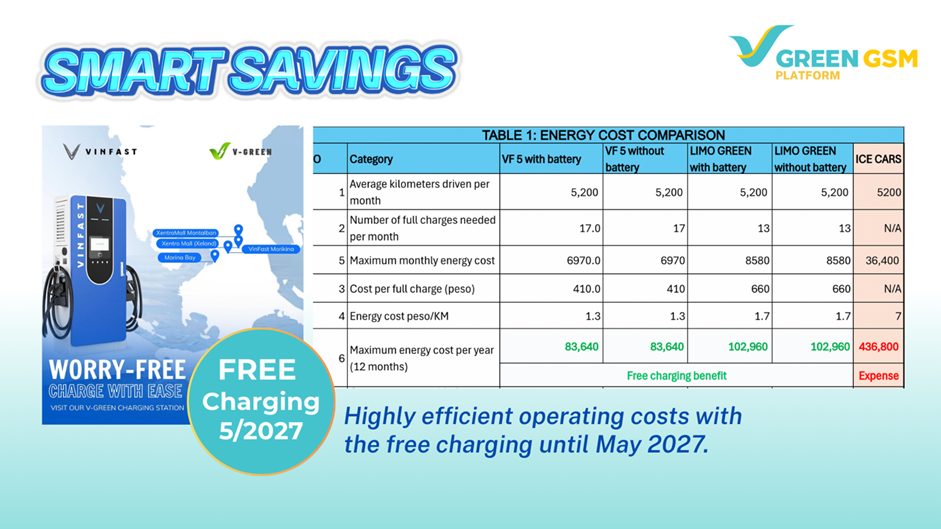Karaniwang ang fuel ang pinakamalaking overhead sa anumang transport operation, ngunit inaalis ng Green GSM Platform ang gastusing ito nang buo. Sa pag-adopt ng electric vehicle technology, puwedeng iwasan ng drivers ang pabago-bagong pump prices at ma-maximize ang daily margins. Para mas suportahan ang profitability, may libreng EV charging hanggang May 2027 sa V-Green Charging Station System, na nagbibigay ng mahigit isang taon ng zero-fuel costs at malaking competitive edge.