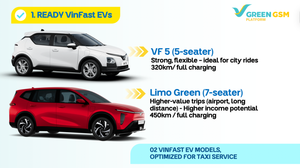 Ready Green Cars: Drivers can choose from two premium VinFast electric models specifically optimized for commercial efficiency: the versatile VF 5 and the spacious Limo Green. These vehicles are celebrated for their durable operation and powerful performance, integrated with cutting-edge smart technology. As a fleet trusted by hundreds of thousands of drivers globally, it guarantees a safe and high-tech experience for every passenger.