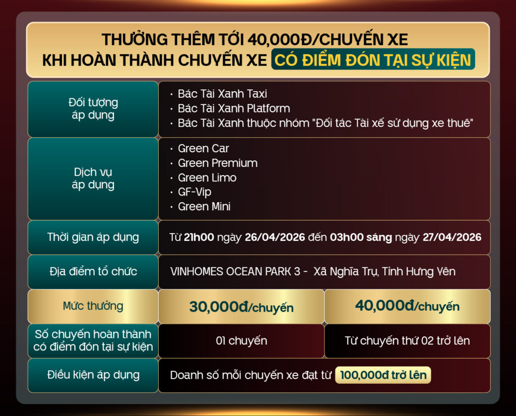 Tiếp nối sức nóng của chương trình Anh Trai Vượt Ngàn Chông Gai, sự kiện Gai Home Concert trở lại như một món quà âm nhạc bùng nổ dành cho các fan hâm mộ. Với quy mô đêm nhạc quy tụ tới hơn 50,000 khán giả, đây chính là cơ hội để Bác Tài Xanh bứt phá thu nhập dịp cuối tuần cùng chương trình thưởng đặc biệt của Green SM sau: