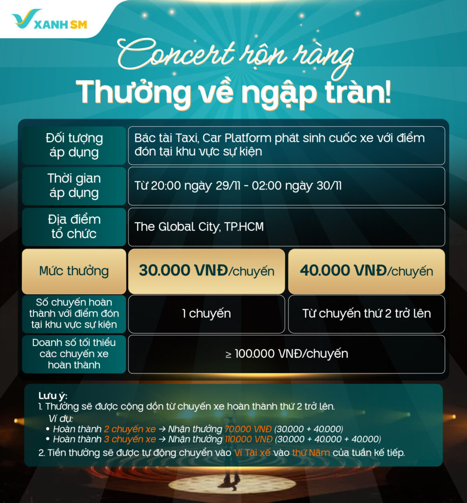 Cuối tuần này, không khí tại The Global City hứa hẹn sẽ cực kỳ sôi động với đêm nhạc “Soobin Live Concert: All-Rounder” thu hút đông đảo Khách hàng đến tham dự. Đây cũng là cơ hội tuyệt vời để Bác Tài Xanh phục vụ Khách và nhận ngay thưởng nóng tại khu vực sự kiện!