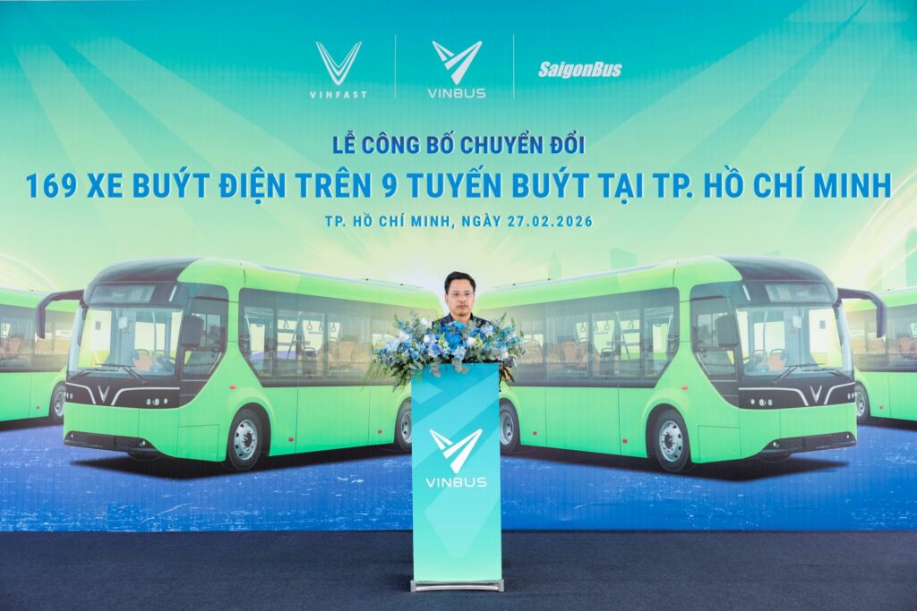 TP.HCM, ngày 27/02/2026 – VinBus công bố chính thức chuyển đổi toàn bộ 169 xe buýt thuộc 9 tuyến gồm 32, 38, 45, 53, 64, 93, 127, 140, 148 tại TP.HCM sang xe buýt điện VinFast, góp phần nâng cao tiêu chuẩn vận hành, chất lượng dịch vụ và đóng góp mạnh mẽ cho công cuộc chuyển đổi xanh giao thông công cộng của Thành phố.